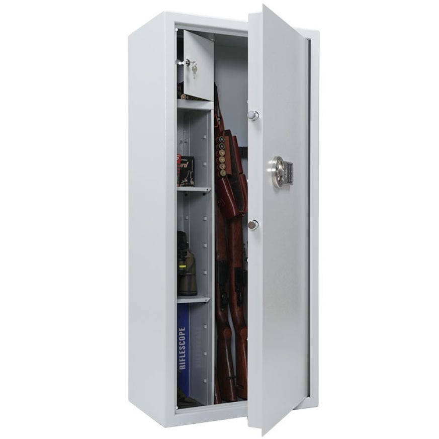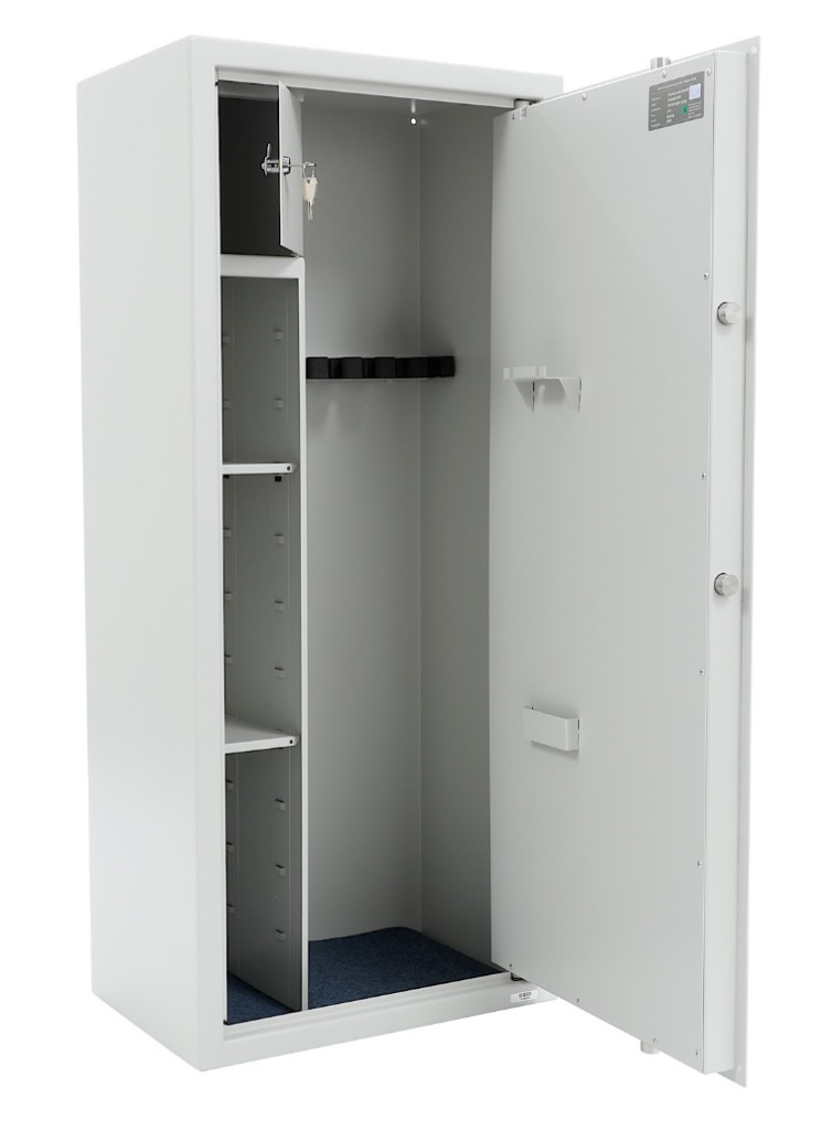Seif sigur si fiabil, certificat pentru rezistenta la efractie conform standardului EN 14450, clasa S1, este ideal atat pentru depozitarea in siguranta a armelor cat si pentru pastrarea munitiilor. Sistemul de inchidere cu bolturi in trei directii ofera protectie sporita. Designul modern, finisat in gri deschis, potrivita pentru orice spatiu profesional sau rezidential.