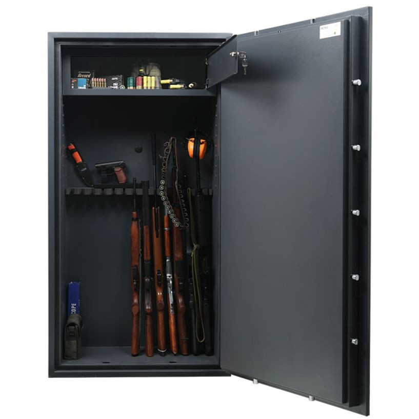 Seif pentru arme, conceput pentru protectie avansata, certificat pentru rezistenta la efractie conform EN 1143-1, clasa I si rezistenta la foc LFS 30P conform EN 15659. Constructia solida, cu pereti dubli intersudati, asigura un nivel ridicat de siguranta impotriva tentativelor de efractie si a incendiilor. Sistemul de inchidere cu bolturi in trei directii garanteaza o blocare eficienta, iar incuietoarea de inalta securitate ofera control si fiabilitate. Seiful este prevazut cu un compartiment interior separat pentru munitie, securizat cu incuietoare proprie si doua chei incluse. Este ideal pentru utilizare rezidentiala sau profesionala. Designul simplu si functional, in gri antracit, se integreaza usor in orice spatiu.