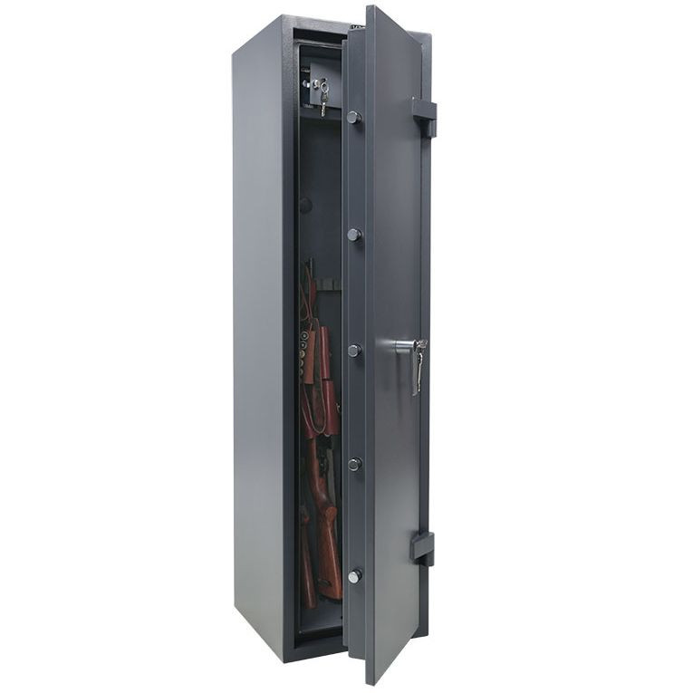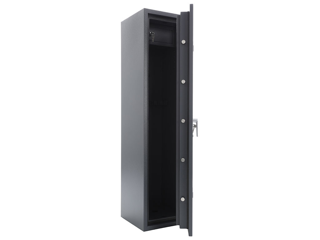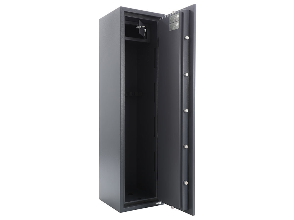 Seif pentru arme, conceput pentru protectie avansata, certificat pentru rezistenta la efractie conform EN 1143-1, clasa I si rezistenta la foc LFS 30P conform EN 15659. Constructia solida, cu pereti dubli intersudati, asigura un nivel ridicat de siguranta impotriva tentativelor de efractie si a incendiilor. Sistemul de inchidere cu bolturi in trei directii garanteaza o blocare eficienta, iar incuietoarea de inalta securitate ofera control si fiabilitate. Seiful este prevazut cu un compartiment interior separat pentru munitie, securizat cu incuietoare proprie si doua chei incluse. Este ideal pentru utilizare rezidentiala sau profesionala. Designul simplu si functional, in gri antracit, se integreaza usor in orice spatiu.