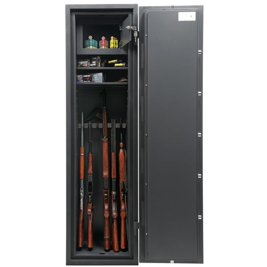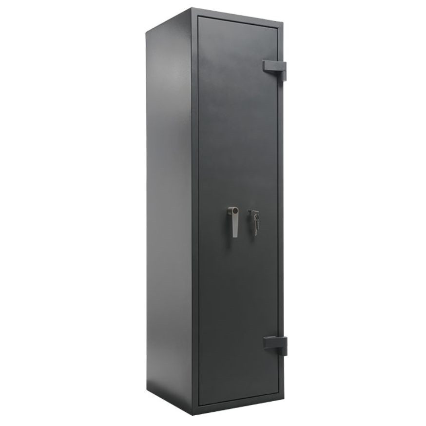 Seif pentru arme, conceput pentru protectie avansata, certificat pentru rezistenta la efractie conform EN 1143-1, clasa I si rezistenta la foc LFS 30P conform EN 15659. Constructia solida, cu pereti dubli intersudati, asigura un nivel ridicat de siguranta impotriva tentativelor de efractie si a incendiilor. Sistemul de inchidere cu bolturi in trei directii garanteaza o blocare eficienta, iar incuietoarea de inalta securitate ofera control si fiabilitate. Seiful este prevazut cu un compartiment interior separat pentru munitie, securizat cu incuietoare proprie si doua chei incluse. Este ideal pentru utilizare rezidentiala sau profesionala. Designul simplu si functional, in gri antracit, se integreaza usor in orice spatiu.