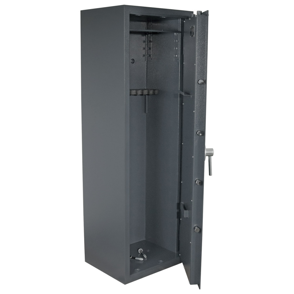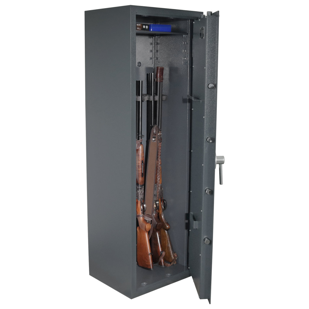 Compact, competent si sigur descrie cel mai bine dulapul de arme Rottner Dakota 8 EN0. Testat si certificat pentru depozitarea a 8 arme lungi. In interior se afla un suport din spuma pentru arma, suport pentru tija de curatare si un raft reglabil.
