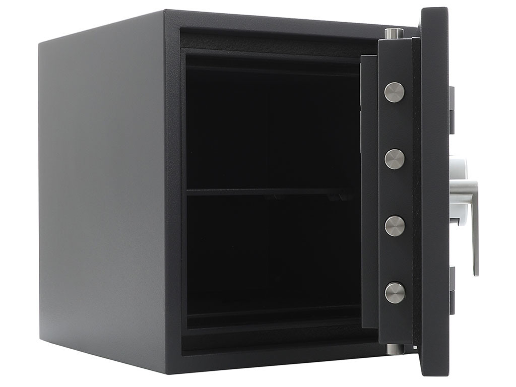 * Corpul si usa seifului sunt fabricate cu doi pereti sudati intre ei, umpluti cu beton rezistent la foc