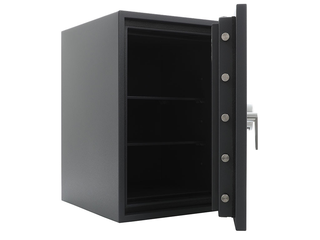 * Corpul si usa seifului sunt fabricate cu doi pereti sudati intre ei, umpluti cu beton rezistent la foc